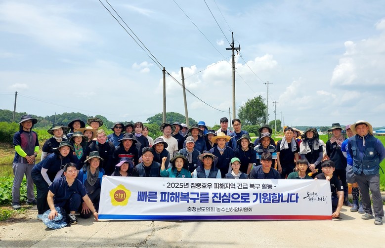 지난 23일 진행된 복구작업에는 농수산해양위원회(위원장 이연희)와 도의회 4개 담당관실(의사‧홍보‧입법‧예산), 충남도 농업기술원, 수산자원연구소 수산물안전성센터 등 직원 60여 명이 참여했으며, 집중호우로 물에 잠긴 가옥 가전제품, 생활용품 등을 정리하고 하천변 쓰레기를 수거하는 등 구슬땀을 흘렸다.