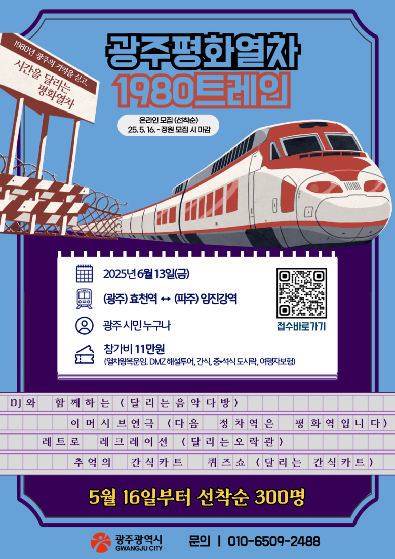 열차에서는 ▲1980년 5월을 주제로 한 음악다방 ▲추억의 간식 퀴즈 ▲연극 공연 등 시민 참여형 문화 콘텐츠가 진행된다. 임진강역 도착 후에는 파주시 DMZ 일원에서 안보현장 견학이 이어져 분단 현실을 직접 마주하고 평화‧통일의 의미를 되새기는 시간을 갖는다.