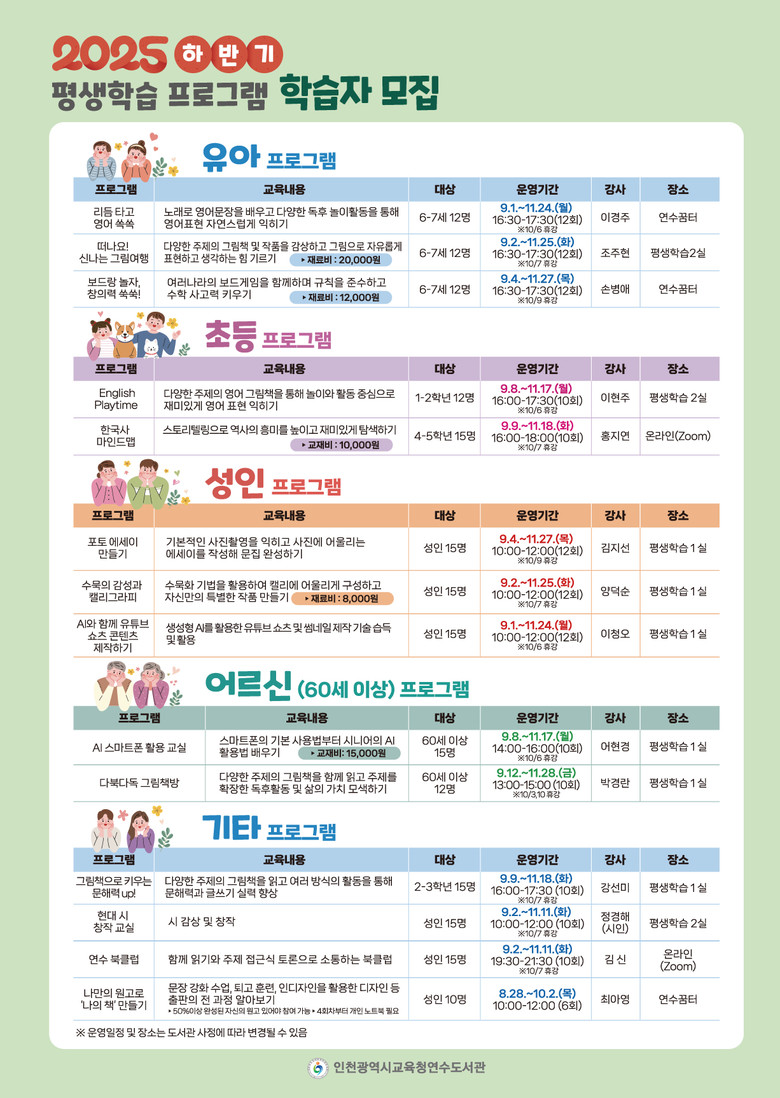 주 프로그램은 ▲유아 대상 ‘리듬 타고 영어 쏙쏙’, 떠나요! 신나는 그림여행, ‘보드랑 놀자, 창의력 쑥쑥! ▲초등 대상 ‘English Palytime’,‘한국사 마인드맵’ ▲성인 대상 ‘포토 에세이 만들기’,‘수묵의 감성과 캘리그라피’, ‘AI와 함께 유튜브 쇼츠 콘텐츠 제작하기’ ▲어르신 대상‘시니어를 위한 AI 스마트폰 활용’, ‘다북다독 그림책방’ 등 10개 프로그램이다.