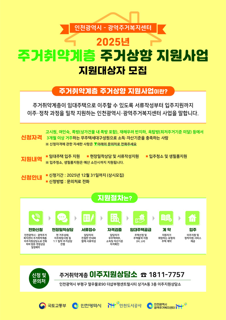 중구는 각 동 행정복지센터를 통해 수시로 대상자를 접수하고 있으며, 자격 요건 심사를 거쳐 적격 가구를 인천도시공사(iH), 한국토지주택공사(LH) 등에 추천해 공공임대주택 연계 지원을 추진할 계획이다.