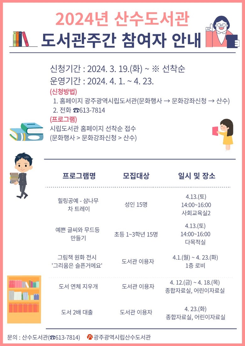 산수도서관도 4월 1일부터 23일까지 ▲힐링공예–삼나무 차 트레이 ▲예쁜 글씨와 무드등 만들기 ▲그림책 원화 전시 등 5개 프로그램을 운영한다.
