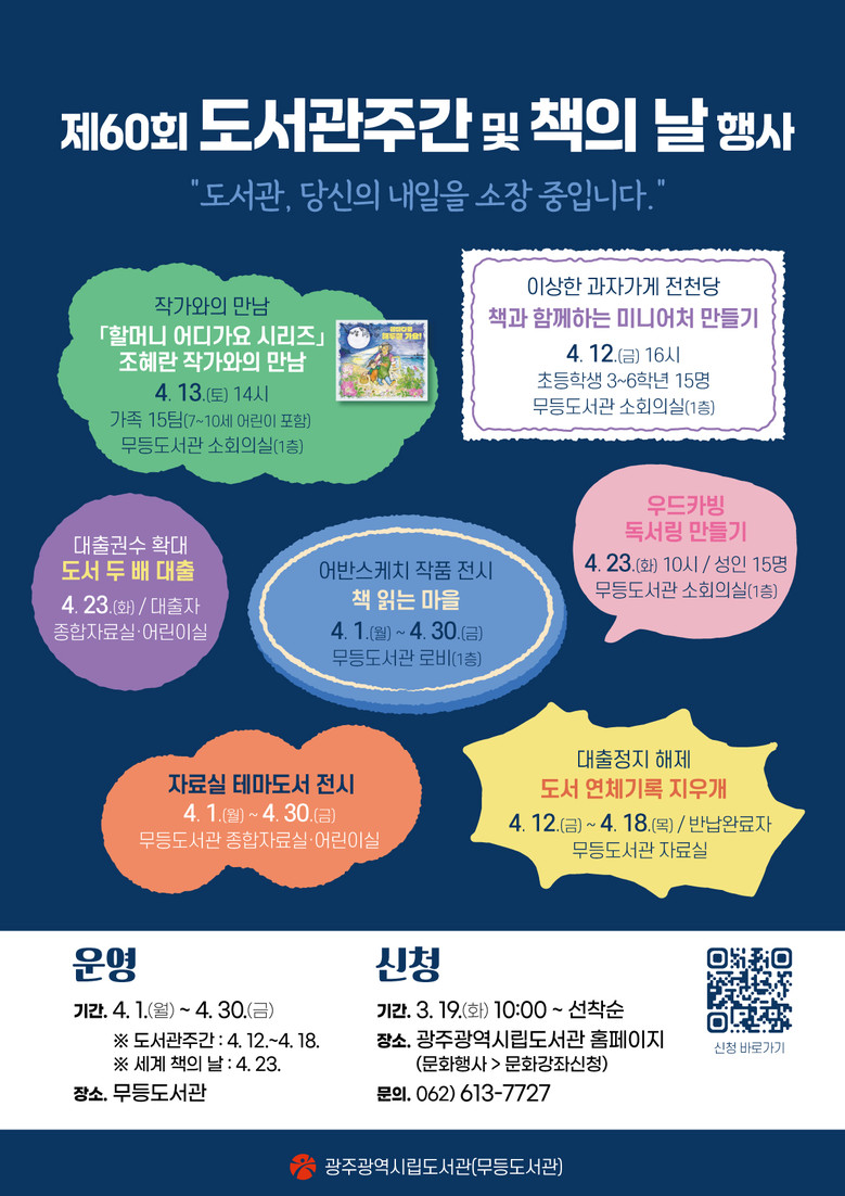 강연 및 체험 행사 접수는 광주시립도서관 누리집에서 할 수 있다. 자세한 내용은 각 도서관(무등 062-613-7727, 사직 062-613-7779, 산수 062-613-7814)으로 문의하면 된다.