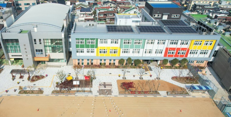수성구 만촌동에 소재한 만촌초등학교는 이번 개축을 통해 노후 학교시설을 안전하고 쾌적한 미래형 교육 환경으로 재구성하였다. 특히 학생 이동 안전을 고려한 효율적 동선 설계와 함께 자연채광과 환기 성능을 강화하여 학습과 휴식이 조화된 건강한 실내 환경을 마련했다.