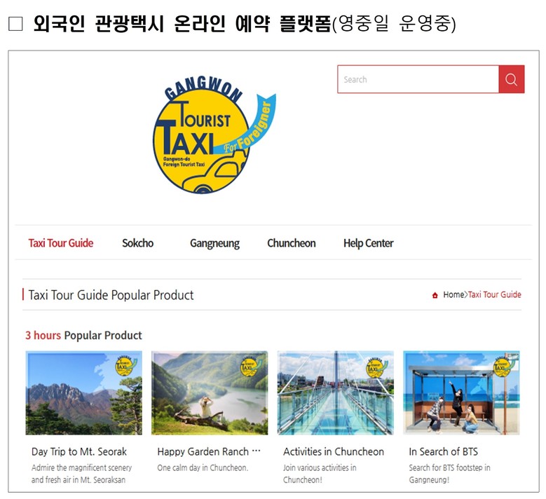 도와 춘천·강릉·속초 3개 시 및 관광재단이 공동으로 추진하는 외국인 관광택시는 교통 인프라가 취약하여 접근성이 낮은 관광지를 포함한 맞춤형 관광 상품이다.