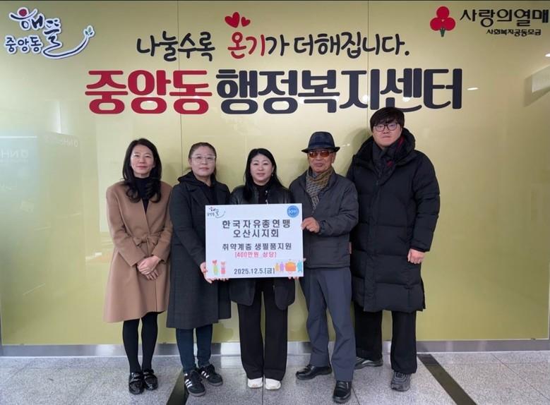[오산시 세계타임즈=송민수 기자] 오산시 중앙동 행정복지센터(동장 백경희)는 한국자유총연맹 오산시지회(지회장 변영일)가 지난 9월부터 12월까지 4개월간 관내 독거어르신과 한부모가족 등 취약계층을 대상으로 약 400만 원 상당의 생필품을 지원했다고 8일 밝혔다.