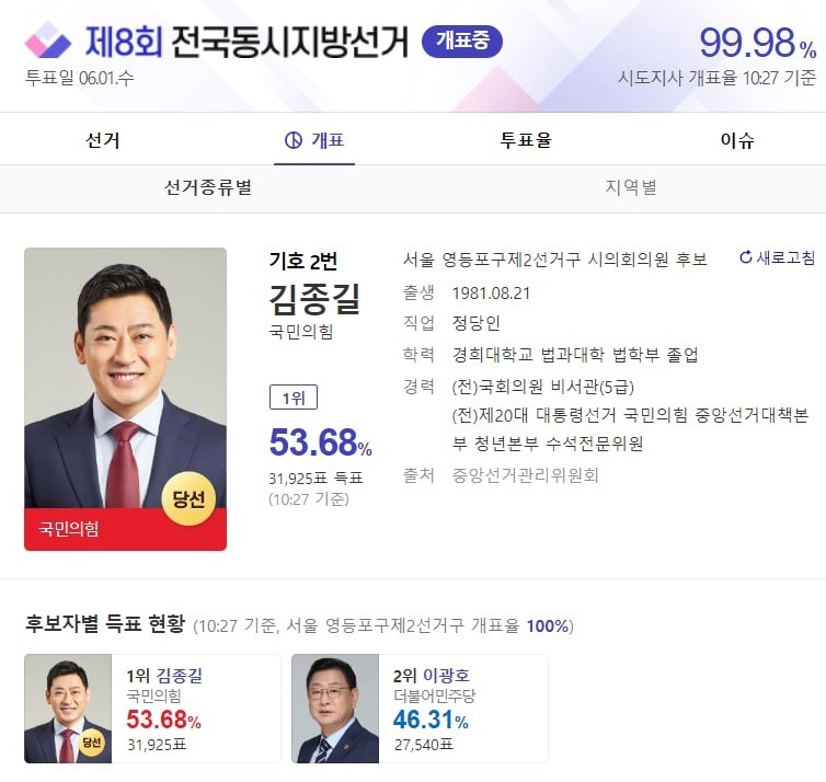 [세계타임즈 백진욱 기자] 국민의 힘 김종길 후보가 제 8회 전국동시지방선거 서울 영등포구제2선거구에서 시의회의원으로 당선됐다.
