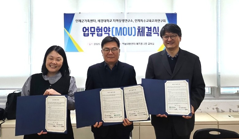 [인제군 세계타임즈=김민석 기자] 인제군가족센터(센터장 정국현)는 2월 28일(금) 하늘내린센터에서 세경대학교 지역상생연구소(소장 최선일), 인제특수교육교과연구회(회장 남현주)와 업무협약(MOU)을 체결했다.