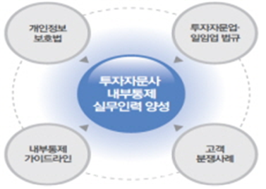 「투자자문사 내부통제」과정은 투자자문사의 감사, 준법감시 등 내부통제 관련업무 종사자 등을 대상으로 내부통제 가이드라인 및 투자자문사 검사사례 등 실무 중심 강의가 특징이며, 투자자문사에 맞는 최적의 내부통제 업무를 습득할 수 있는 단기교육이다.