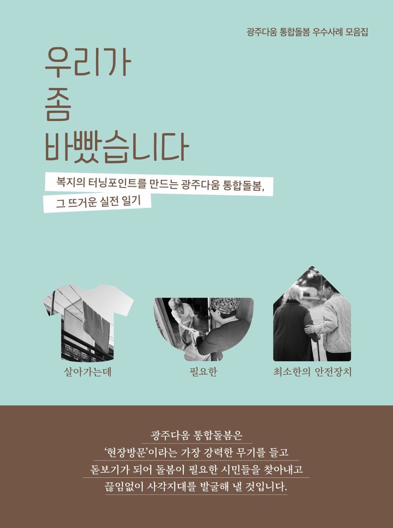 광주광역시(시장 강기정)는 지난해 4월 1일 시작한 광주다움 통합돌봄을 현장에서 실행한 동행정복지센터 담당 공무원의 우수사례 모음집 ‘우리가 좀 바빴습니다’를 발간했다.