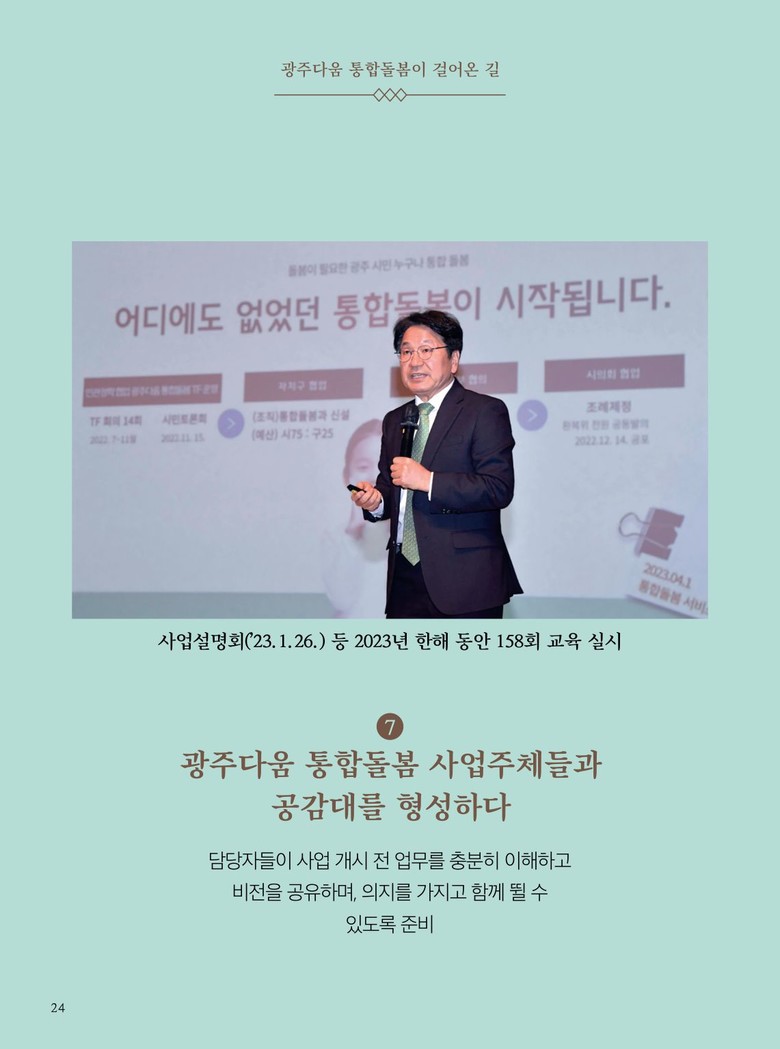 또 광주다움 통합돌봄 소개, 정책이 실현되는 과정을 소개한 광주다움 통합돌봄이 걸어온 길 등으로 구성됐다.