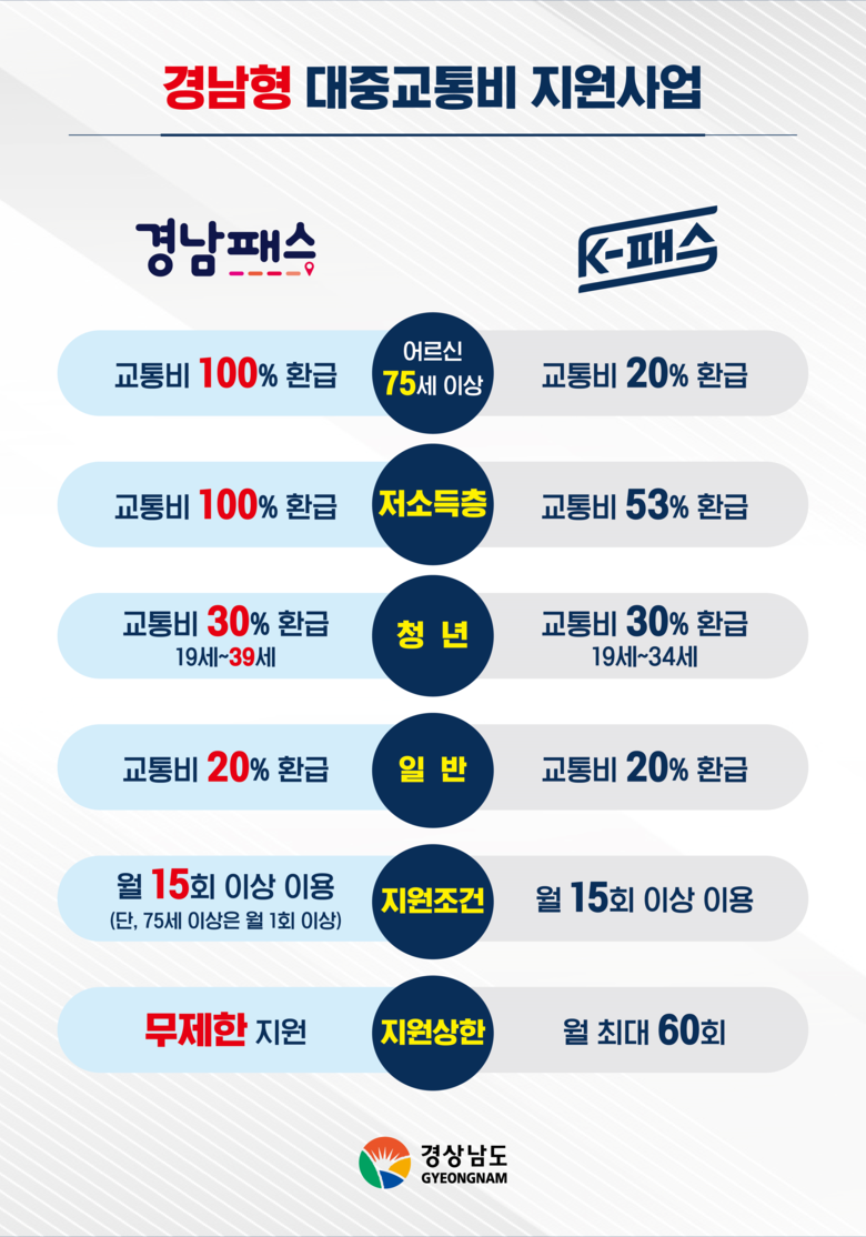 경남패스는 시내버스, 지하철 등의 대중교통을 한 달에 15회 이상(75세 어르신은 1회이상) 이용하면 이용요금의 20~100%를 환급 받을 수 있다. 특히, 전국 최초로 75세 이상 어르신과 저소득층에게 100% 환급함으로써 대중교통 복지를 실현한 사업이다.