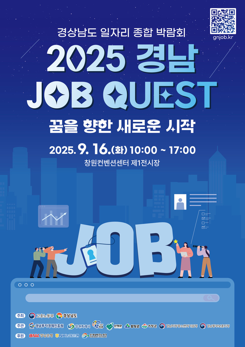 - 기업정보, 박람회 정보, 사전등록 등 취업지원 서비스 제공 시작 [세계타임즈=경남 최성룡 기자] 경상남도(도지사 박완수)는 경상남도 일자리 종합박람회 전용 누리집 ‘2025 경남 JOB QUEST’(gnjob.net)’를 오픈했다.