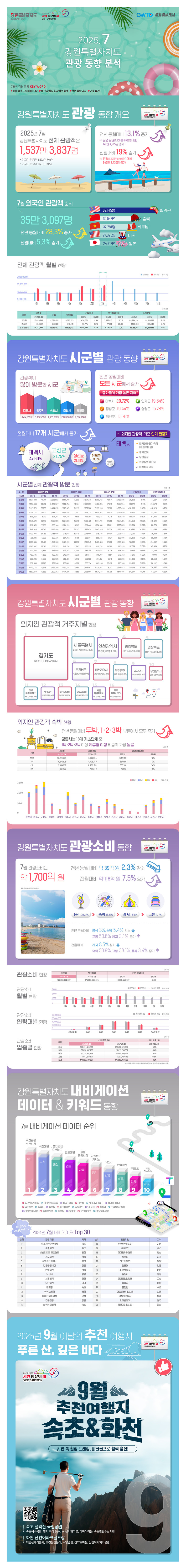 ‘강원 방문의 해 7월 추천 여행지’로 집중 조명된 동해시· 홍천군의 주요 관광지 경우, 동해시는 도째비골해랑전망대(65.17%), 망상해변(18.47%)이, 홍천군은 가리산자연휴양림(30.93%), 화로구이 골목(17.82%) 등의 관광지가 전년 동월대비 높은 관광객 증가세를 보였다.