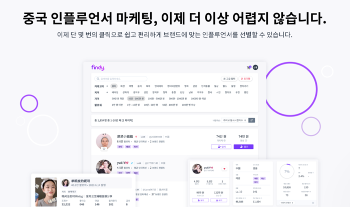 와이톤은 여러 캠페인의 마케팅을 직접 운영하면서 이러한 문제점을 해결하기 위해 자체적으로 데이터 마케팅 솔루션 ‘파인디(FINDY)’를 개발하게 됐다. 한국 브랜드들도 중국 데이터를 쉽게 이해하고 유의미한 마케팅을 할 수 있도록 그간 쌓아온 노하우를 데이터화한 것이다. 파인디는 효과적인 인플루언서 선별, 잠재고객이 될 수 있는 타겟 데이터 파악, 예산에 맞춘 최적화된 인플루언서 믹스 등 성공적인 마케팅을 위한 필수 요소들을 제공한다.