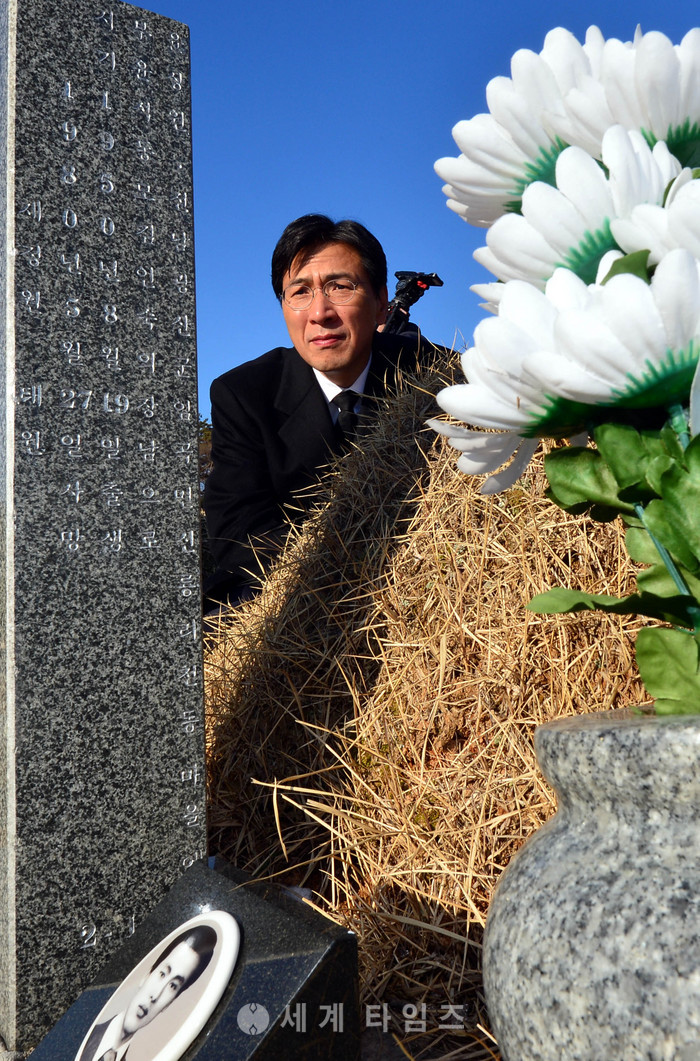 더불어민주당 대권 주자인 안희정 충남지사가 12일 오전 광주 북구 운정동 국립5·18민주묘지 열사들의 묘역에서 무릎을 꿇고 참배하고 있다. 2017.02.12.