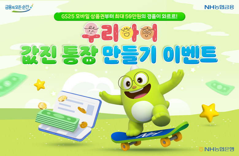 이번 이벤트는 두가지 방식으로 진행한다. 이벤트❶은 부모가 NH올원뱅크에서 비대면으로 미성년 자녀의 입출식계좌를 개설하면 1,000명을 추첨해 GS25 모바일상품권 2만원권을 제공하며, 설날을 맞아 2월 1일부터 2월 16일 사이에 참여하면 추첨을 통해 50만원(1명), 30만원(3명), 5만원(16명)을 추가 제공한다.