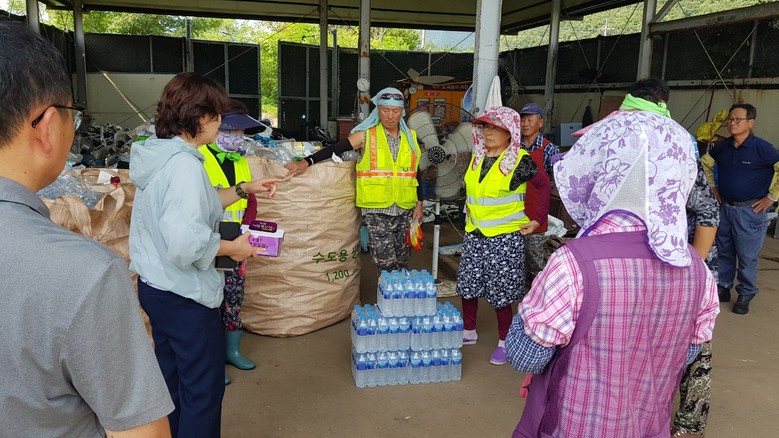 [강화군 세계타임즈=심하린 기자] 강화군 화도면(면장 조순이)이 지난 21일, 사기리 재활용 선별장에서 무더운 날씨 속 현장에서 근무하고 있는 선별장 근로자들을 응원하는 시간을 가졌다.