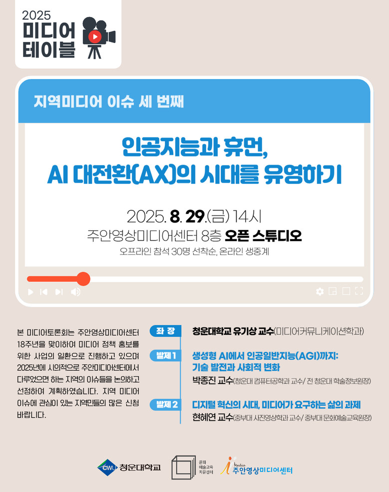 이번 토론회는 인공지능 기술의 비약적 발전 속에서 인간과 미디어의 관계를 재조명하고, 지역 사회가 함께 준비해야 할 미래 방향을 모색하고자 마련됐다.