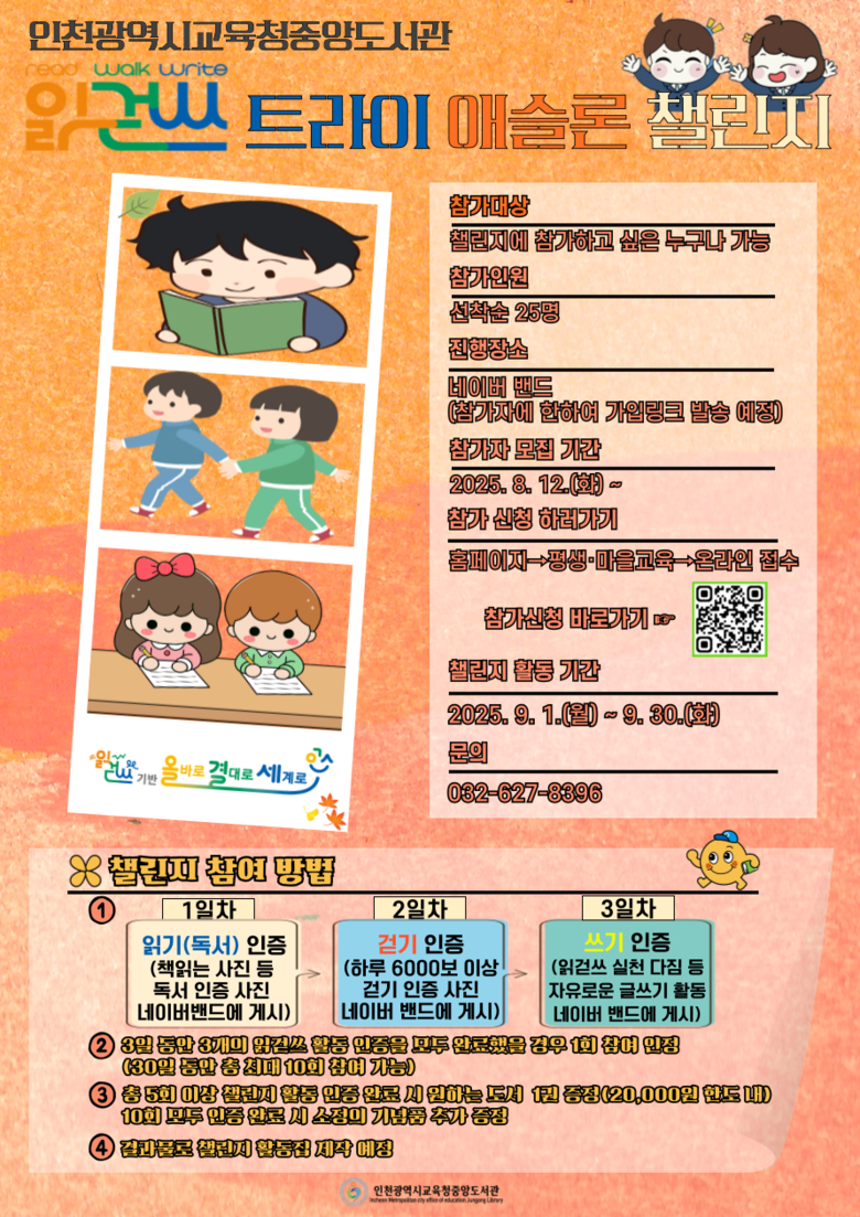 이번 챌린지는 인천 시민이면 누구나 참여할 수 있으며, 8월 12일(화)부터 중앙도서관 누리집(https://lib.ice.go.kr/jungang/index.do)을 통해 신청 가능하다. 모집 인원은 25명이다.