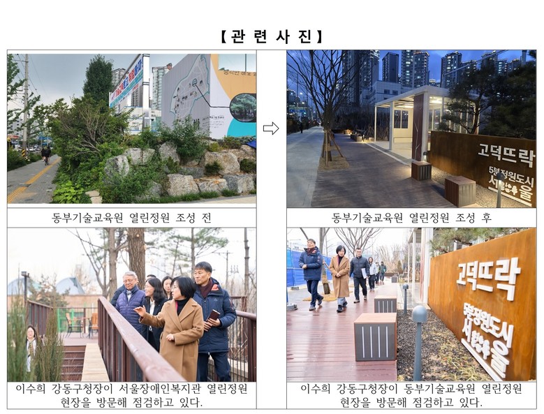 [강동구 세계타임즈=이장성 기자] 서울 강동구(구청장 이수희)는 동부기술교육원(고덕동 317-1)과 서울장애인종합복지관(고덕동 317-24)에 ‘열린정원’을 조성해 고덕동 일대 보행환경을 개선하고 주민과 시설 이용자가 함께 누릴 수 있는 생활 속 쉼터를 새롭게 선보였다고 9일 밝혔다.