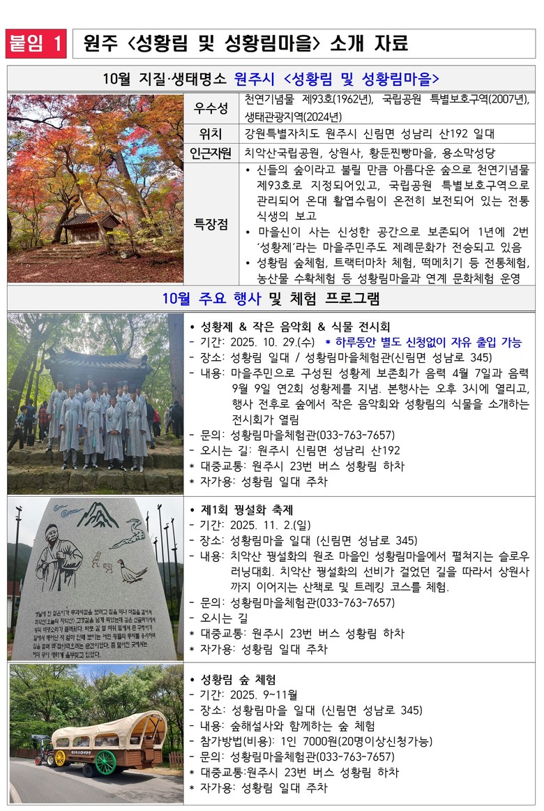 이와 함께 성황림마을에서는 △‘제1회 꿩설화 축제’(11.2.)가 열려 치악산 꿩설화의 배경지를 따라 슬로우 러닝대회와 트레킹 프로그램을 체험할 수 있다. 또 △‘성황림 숲체험’(~11월) 프로그램을 통해 전문 해설사와 함께 천연기념물 숲을 탐방하며 생태적 가치를 직접 느껴볼 수 있다.