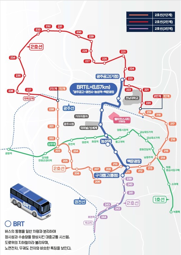 이에 따라 광주시는 ‘제1차 간선급행버스체계(BRT) 종합계획 수정계획(2021~2030)’에 백운광장(옛 대동고)에서 농성역, 광천사거리, 경신여고를 거쳐 광주공고까지 이어지는 총연장 8.67㎞의 ‘백운-매곡 BRT’ 노선을 반영했다.