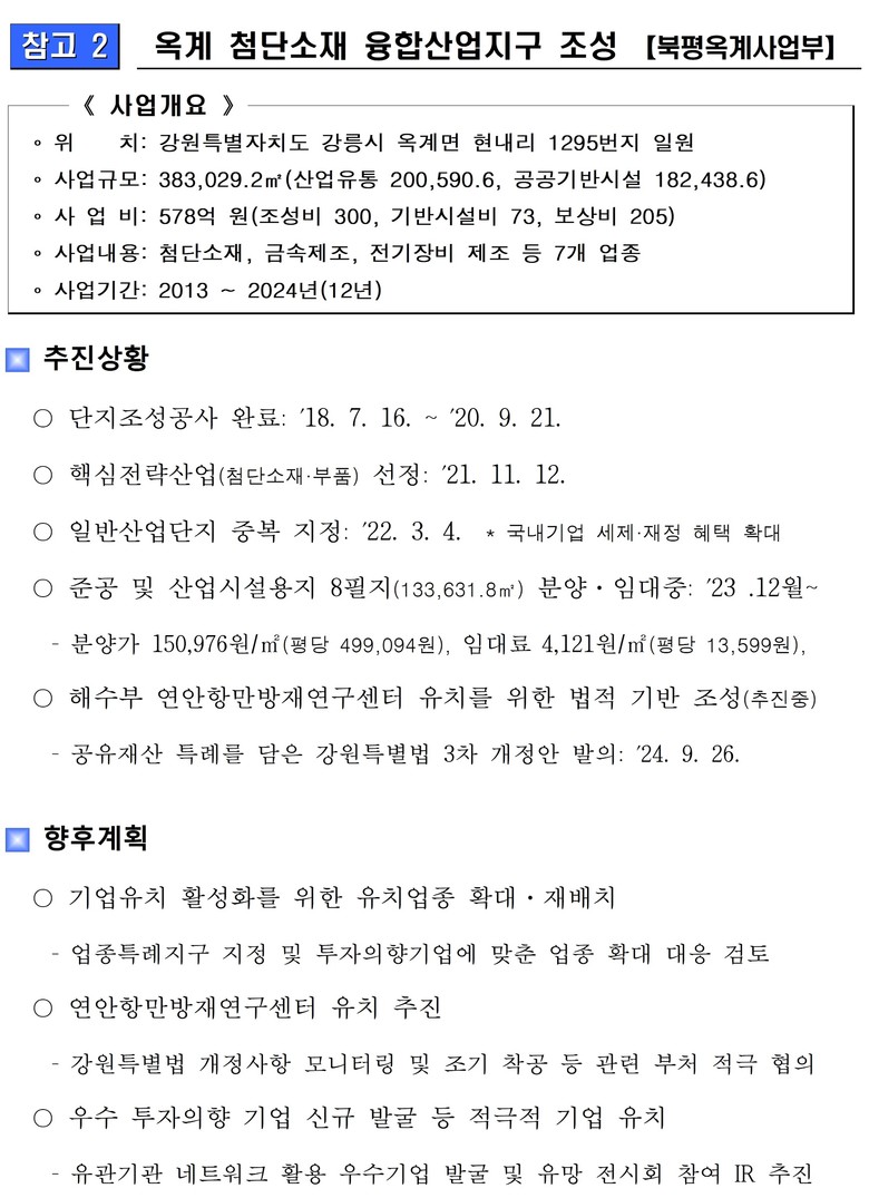 또한 ”옥계지구는 차별화된 분양·임대 전략과 함께 연안항만방재연구센터의 유치를 조속히 추진해 미래 첨단산업의 중심지로 발전할 수 있도록 노력하겠다.“라고 덧붙였다.