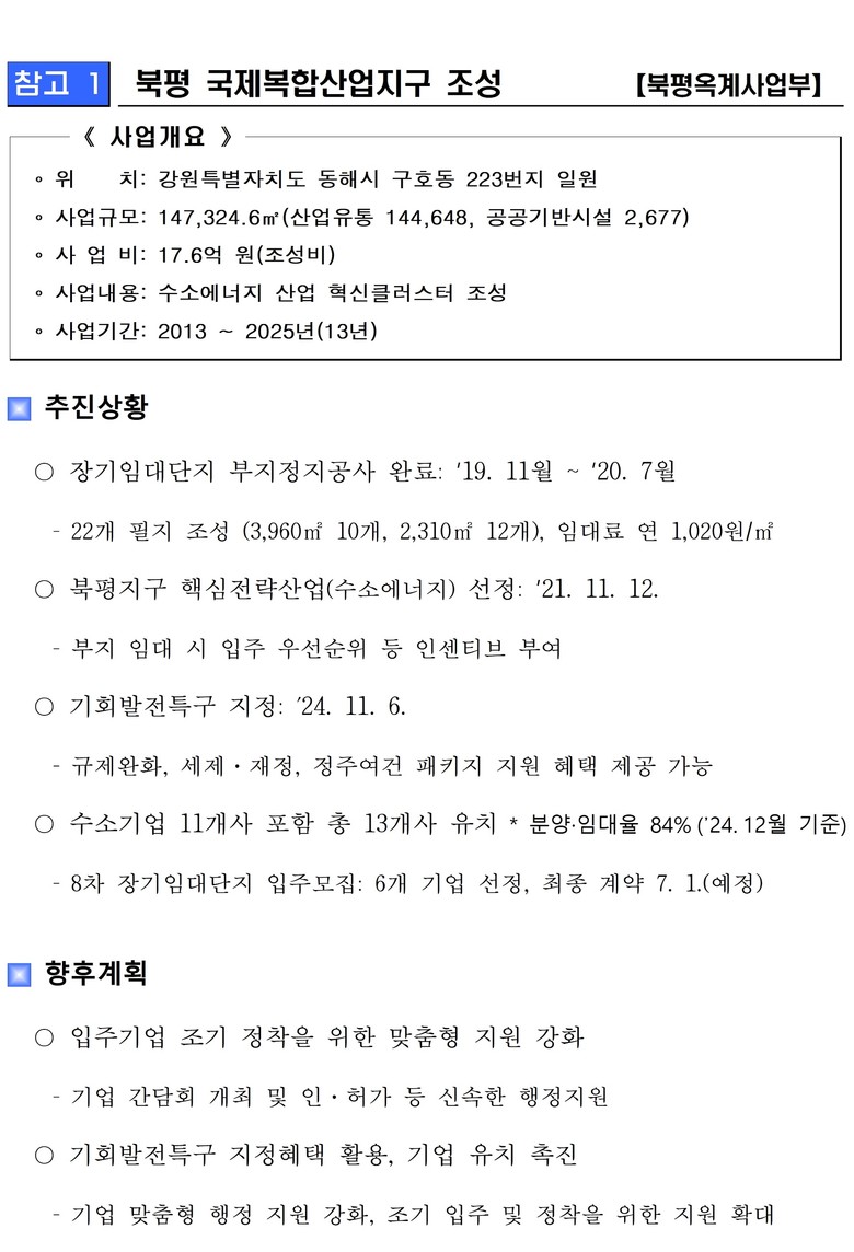 심영섭 강원경제자유구역청장은 “북평 지구는 수소 중심 기업 유치를 통해 연내 전 필지 분양·임대 완료가 예상된다”며, “향후 국가 수소 산업 정책과 연계해 신성장의 거점으로 육성되고 고용 창출 및 지역 경제 활성화에 크게 기여할 것”이라고 밝혔다.