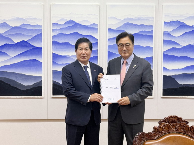 | ▲ 공영민 고흥군수가(왼쪽)가 지난 16일 국비 확보를 위해 우원식 국회의장(오른쪽)과 면담 후 기념사진을 찍고 있다 |