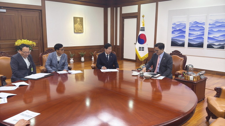 | ▲ 공영민 군수(오른쪽에서 두번째)가 지난 16일 국비 확보를 위해 우원식 국회의장(맨 오른쪽)과 면담하고 있다 |