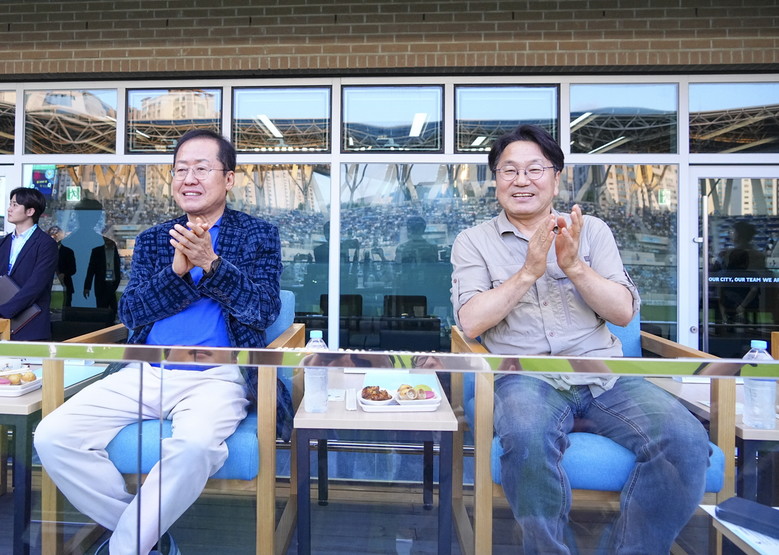 강 시장과 홍 시장은 21일 저녁 대구시 DGB대구은행파크에서 열린 K리그 ‘광주FC-대구FC 축구 경기’를 관람했다. 양 시장은 경기 시작 전 그라운드에 올라 경기장을 찾은 관람객들에게 인사했다. 양 시장이 스포츠 경기를 함께 관람한 것은 이번이 처음이다.