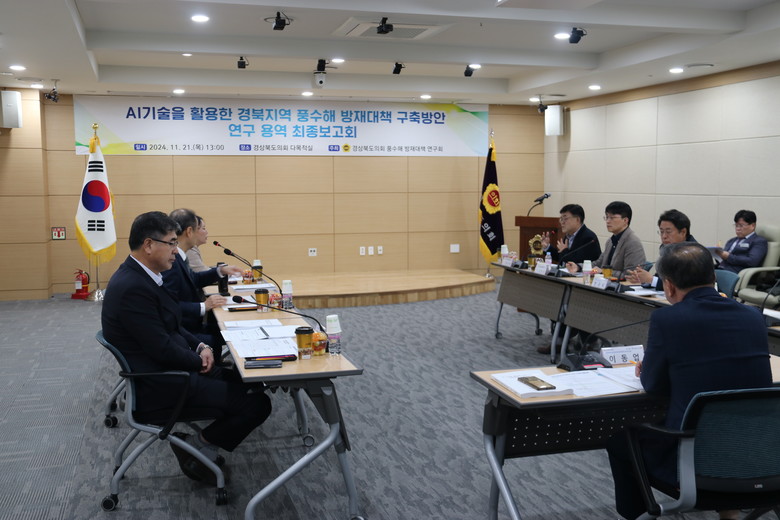 [경북 세계타임즈=한윤석 기자] 경상북도의회 풍수해 방재대책 연구회(대표 이동업 의원)는 21일(목) 도의회 다목적실에서 “AI기술을 활용한 경북지역 풍수해 방재대책 구축방안 연구”의 최종보고회를 성공적으로 개최했다.