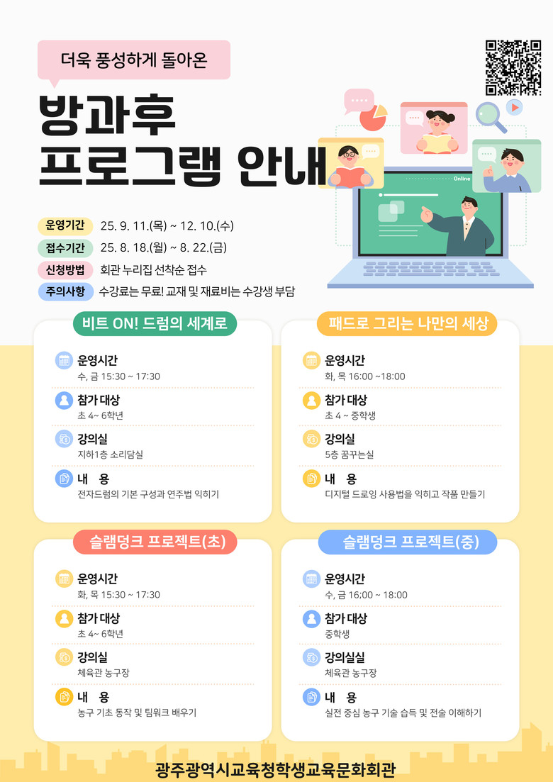 대상은 초등학교 4~6학년 학생과 중학생이다. 개설 강좌는 ▲비트 ON! 드럼의 세계로 ▲패드로 그리는 나만의 세상 ▲슬램덩크 프로젝트 초등부 ▲슬램덩크 프로젝트 중등부 등 예술·체육 관련 4개다. 각 강좌는 15명씩 총 60명이 참여할 수 있다.