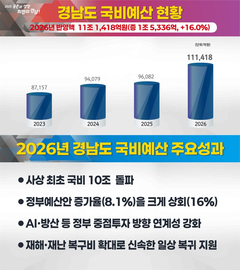 경남도가 밝힌 2026년 국비예산의 주요 성과와 특징은 △사상 처음 국비 10조 원 돌파 △정부예산안 증가율(8.1%)을 상회하는 국비예산 증가율(16%) 달성 △인공지능(AI)·연구개발(R&D), 주력산업 고도화 등 정부 중점투자 방향 연계성 강화 △신속한 일상 복귀 지원을 위한 재해·재난 복구비 확대 등으로 요약된다.