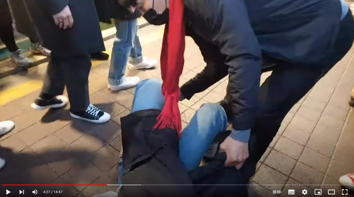 | ▲ 홍대앞 유세 현장에서 넘어트린 여학생을 들어 던지자 일부시민이 제제 |