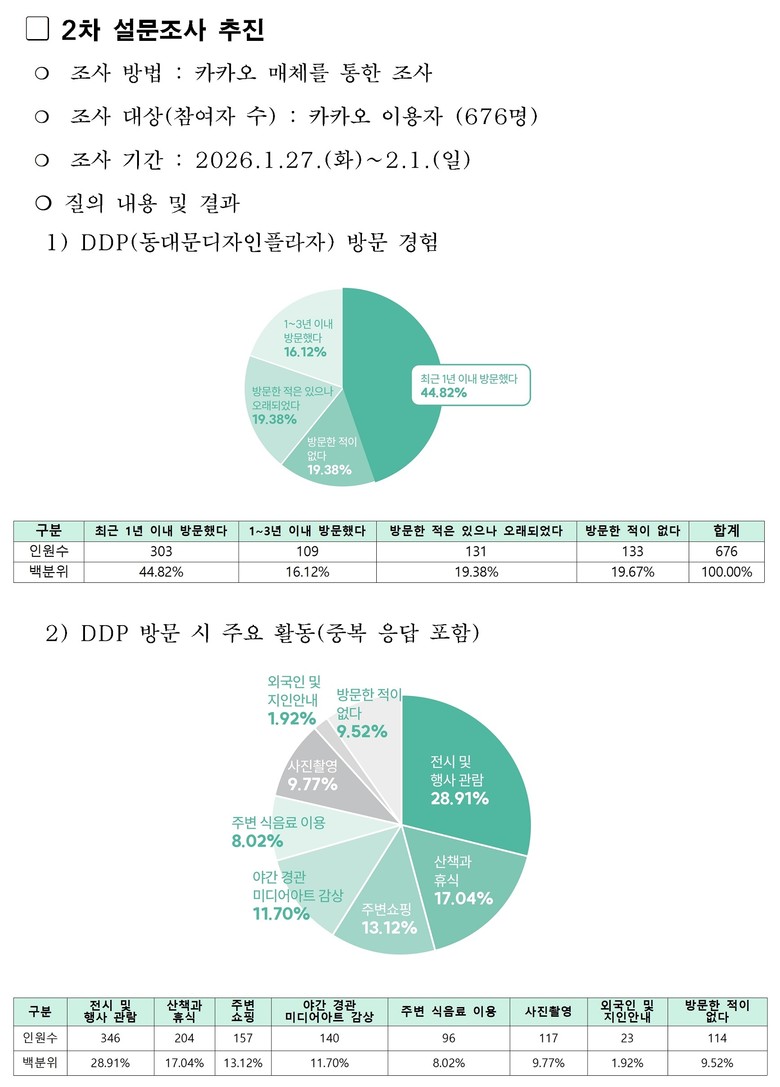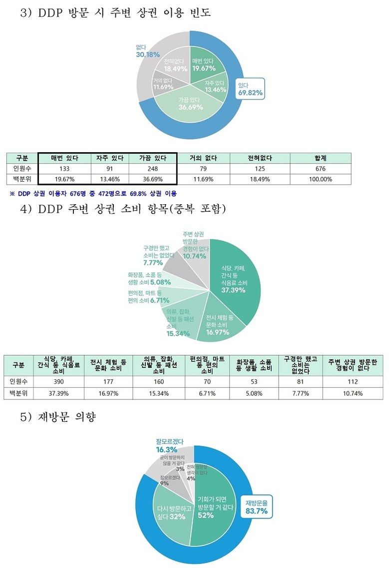 이외에도 올해 1월 서울시민은 물론 전 국민 676명을 대상으로 추가 설문조사(카카오)에서도 80%에 달하는 543명이 DDP를 최소 1회 이상 방문했고, 이후 상권 이용했다는 답변도 472명(69.8%)에 달한다.