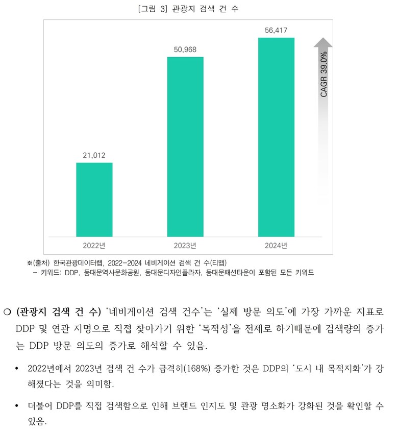 DDP 및 연관 지명 관련 네비게이션 검색 건수(한국관광데이터랩)도 ’22년 2만 1,012건에서 ’24년 5만6,417건으로 2.7배 늘었다. 이는 DDP가 우연히 들르는 공간이 아니라, 직접 찾아가는 목적지로 자리 잡고 있음을 의미한다.