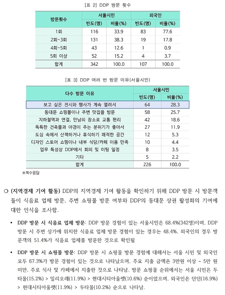 먼저 서울디자인재단이 지난해 서울시민 500명과 외국인 107명을 대상으로 한 조사 결과 서울시민 응답자 중 68.4%(342명)가 DDP 방문 경험이 있다고 답했고 45.2%는 두 번 이상 DDP를 찾았다고 밝혔다.