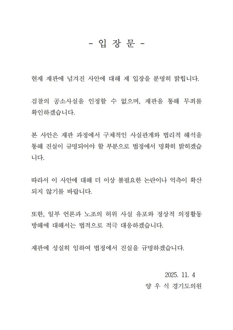 검찰의 공소사실을 인정할 수 없으며, 재판을 통해 무죄를 확인하겠습니다.