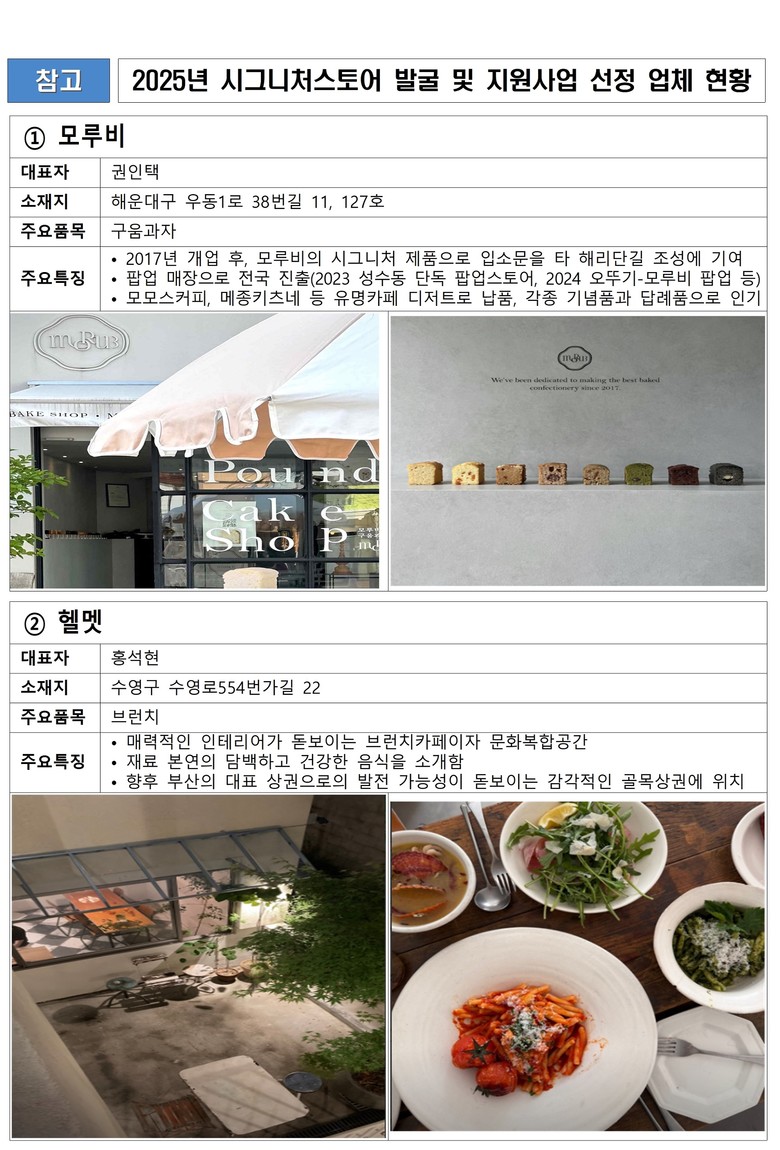 최종 시그니처스토어로 선정된 지역가치 창업가(로컬크리에이터) 요건에 부합하는 잠재력 있는 소상공인 2개 사는 ▲해운대구 모루비 ▲수영구 헬멧이다.