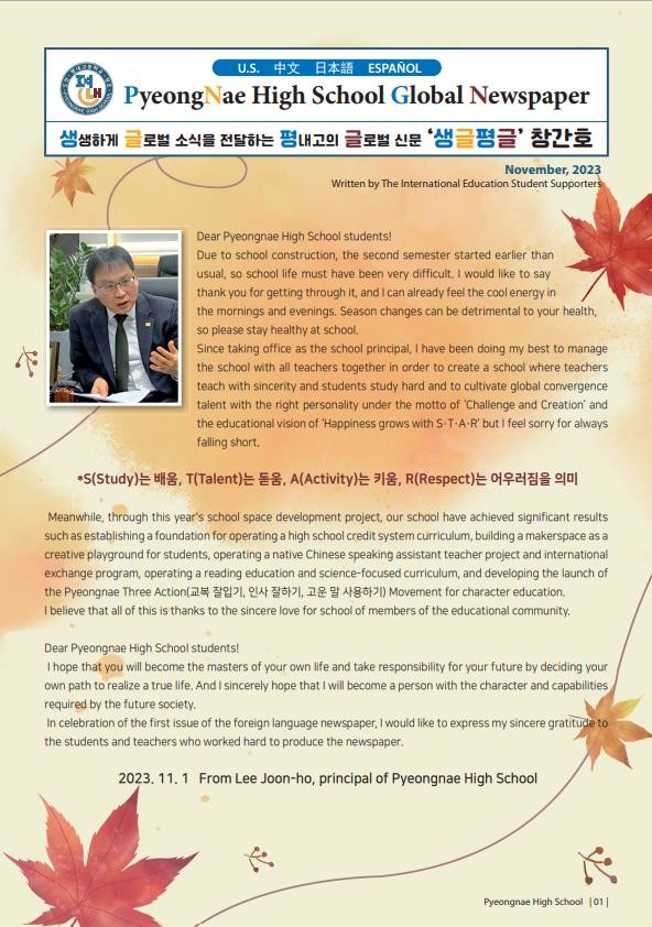 [남양주시 세계타임즈=송민수 기자] 경기도구리남양주교육지원청 평내고등학교(교장 이준호)는 2023 경기미래교육을 실행하고자 올해 국제교육부를 신설하여‘학생 맞춤형 외국어 교육을 통한 글로벌 역량 강화’를 학교자율과제로 선정 후 다양한 국제교육 프로그램을 운영하였다.