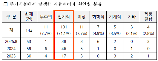 서울시가 제출한 자료에 따르면, 최근 3년간 서울시 내 리튬배터리 화재는 총 346건 발생했으며, 이 중 주거시설 화재는 142건(41%)에 달한다. 특히, 주거시설 화재의 71% 이상은 충전 중 폭발이나 발화 등 ‘전기적 요인’에 의해 발생했으며, 대부분 실내에서 충전 중 사고가 발생한 것으로 파악됐다.