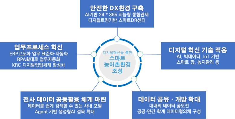 한국농어촌공사는 올해도 디지털 혁신을 계속한다. 우선, 디지털 업무 체계 전환을 위해 인공지능 기술을 본격적으로 도입한다. 인공지능(AI) 시스템을 ‘인공지능(AI) 에이전트’로 확장해, 업무 관련 질의응답뿐만 아니라 직원 맞춤형 인공지능 서비스를 제공할 예정이다. 또한 전사적 자원관리(ERP) 시스템을 고도화해 불필요한 업무를 줄이고 표준화된 업무처리 절차를 마련할 예정이다.