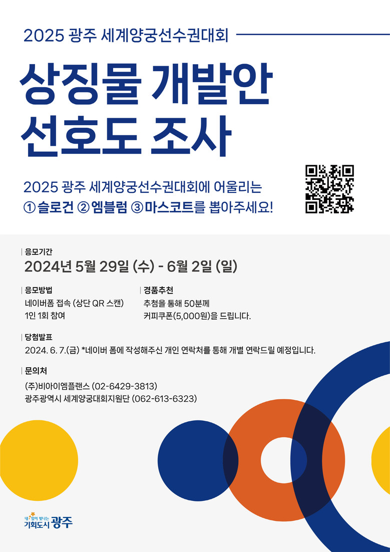 김요성 문화체육실장은 “이번 선호도 조사를 통해 광주시민뿐만 아니라 전 국민이 세계양궁선수권대회에 관심을 가져주길 바란다”며 “대회 성공 개최를 위해 각 분야에서 완성도 높은 준비를 해나가겠다”고 말했다.