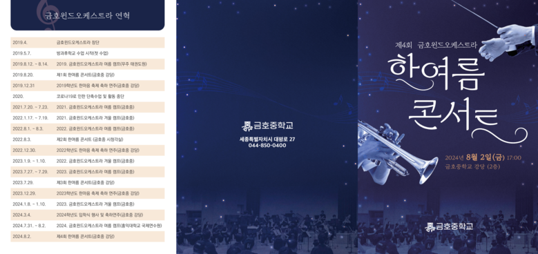 - 오는 8월 2일 17시, 학생, 학부모, 지역 주민 등 누구나 참석 가능 - [세종 세계타임즈=이채봉 기자] 금호중학교(교장 강승연, 이하 금호중) 금호윈드오케스트라(지휘자 연춘흠)는 8월 2일 17시에 금호중 2층 강당에서 학생, 학부모, 교직원, 동창회, 지역 주민 등을 대상으로 ‘제4회 한여름 콘서트’를 개최한다.