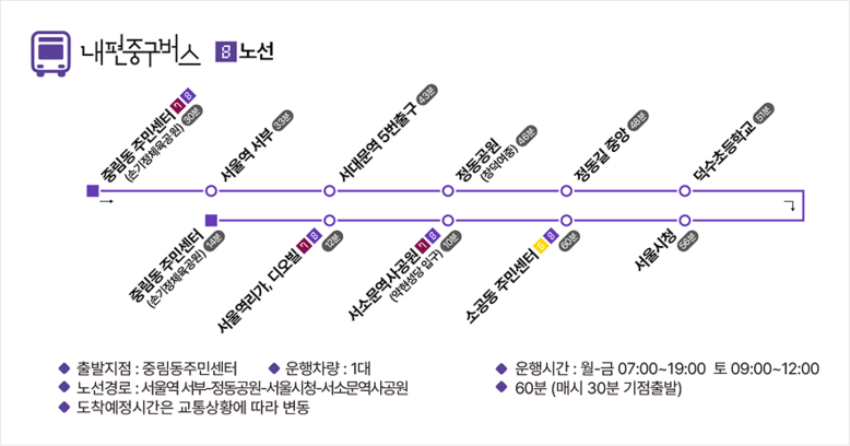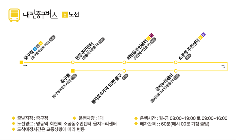 주요 거점에서는 노선 간 환승도 가능하다. △충무아트센터 △신당누리센터 △가온도서관 △중구청소년센터 △중구청 △소공동주민센터 △회현역 6번 출구 △서울역 서부 등 8곳에서 편리하게 갈아탈 수 있다.