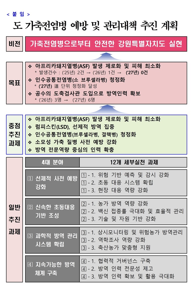 석성균 강원특별자치도 농정국장은 “가축전염병은 축산업을 넘어 국민 건강과 직결되는 중요한 사안”이라며, “지속 가능한 축산업 기반 마련을 위해 자율 방역 역량을 끌어올리는 것이 핵심 과제”라고 강조했다. 이어 “이번 3개년 종합계획을 통해 강원특별자치도가 가축전염병 청정지역으로 자리매김할 수 있도록 모든 행정 역량을 집중하겠다”고 밝혔다.