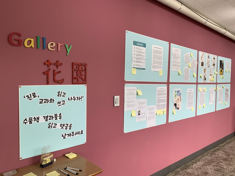 또한, 학생들이 제작한 의견문, 리플릿, 일러스트레이션, 저자와의 가상 인터뷰, 뉴스 기사문, 서평 등 다양한 형태의 결과물을 화원 갤러리에 전시하여 친구들과 선생님의 댓글로 피드백을 받으며 서로의 의견을 공유하고 성찰의 기회도 갖는다.