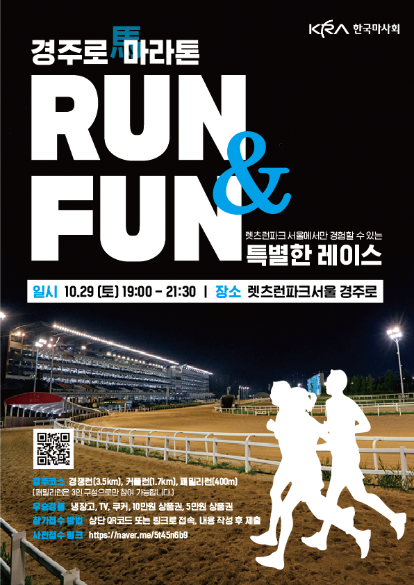 가족·연인들이 참여할 수 있는 이색적인 이벤트도 개최된다. 렛츠런파크 서울에서는 오는 29일 말들이 질주하는 경주로를 직접 뛰어보는 색다른 경험을 할 수 있는 ‘경주로 마라톤 RUN&FUN 3.5km’이 열린다. 당일 저녁 7시부터 진행되는 이번 행사는 3.5km 달리기로 기록을 겨루는 경쟁 부문과 커플이 함께 뛰는 커플 경주, 어린이를 포함한 가족이 참가 가능한 가족 마라톤, 총 3개 부문으로 시행된다.