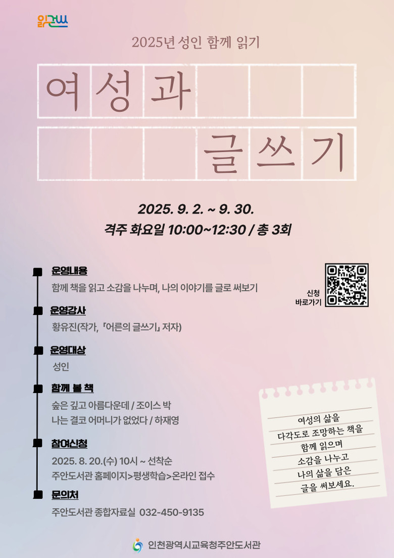 참여 신청은 8월 20일(수) 오전 10시부터 주안도서관 누리집에서 가능하며, 자세한 사항은 주안도서관 누리집(https://lib.ice.go.kr/juan) 또는 종합자료실(☎032-450-9135)로 문의하면 된다.